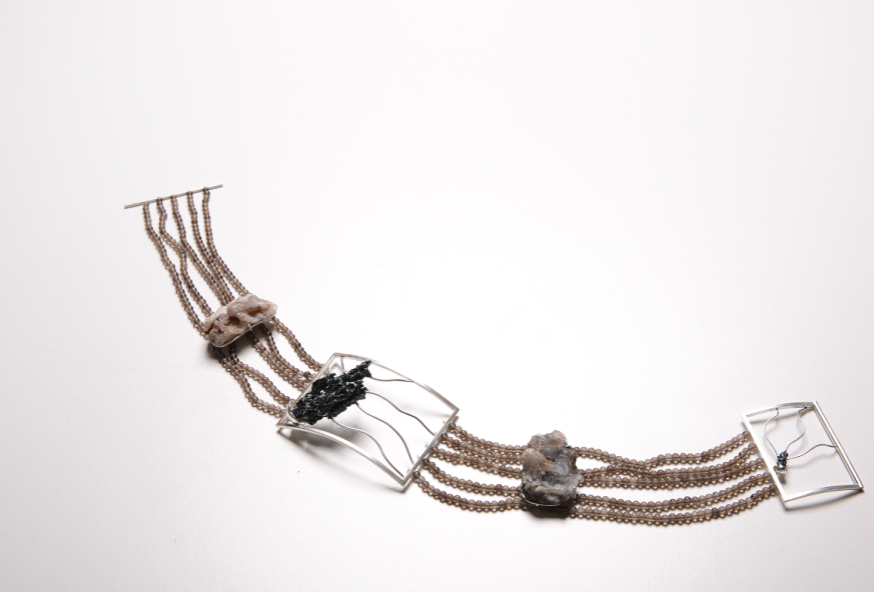 Die Arbeit verwendete Materialien wie Silber und Edelsteine. Die wellige und leicht polierte Textur dieser Arbeit symbolisiert die Verbindung mit dem Meer. Der Tintenfisch hat auch zwei mächtige Tentakeln, die die Funktion haben, das Armband an der Hand zu halten. Der Träger des Armbands kann den Tintenfisch leicht an seinem Arm fixieren und die Form der Tentakeln leicht verändern.